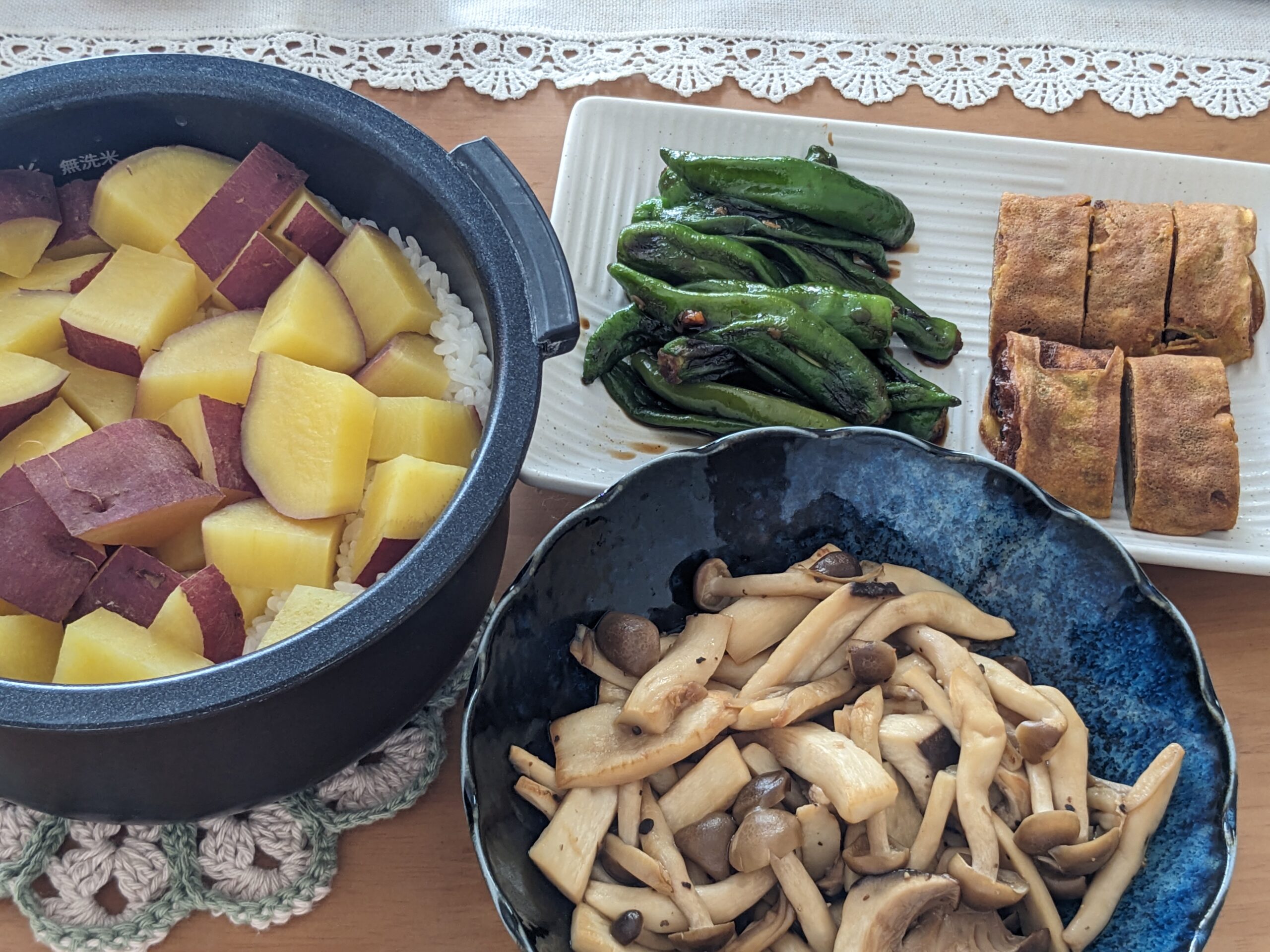 さつまいもごはん、きのこソテー、ししとうの甘辛、たまごやき